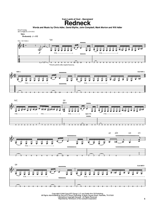 Digital Sheet Music for Redneck by Chris Adler, Will Adler, Randy Blythe, John Campbell, Lamb Of God, Mark Morton scored for Guitar Tab; id:393659