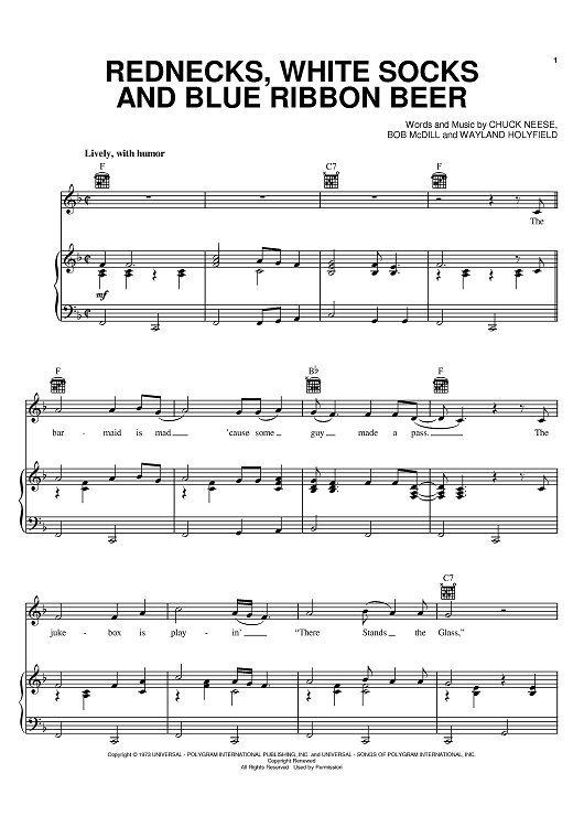 Digital Sheet Music for Rednecks, White Socks And Blue Ribbon Beer by Bob McDill, Wayland Holyfield, Johnny Russell, Chuck Neese scored for Piano/Vocal/Chords; id:383035