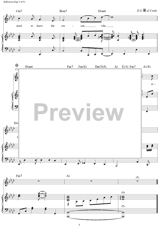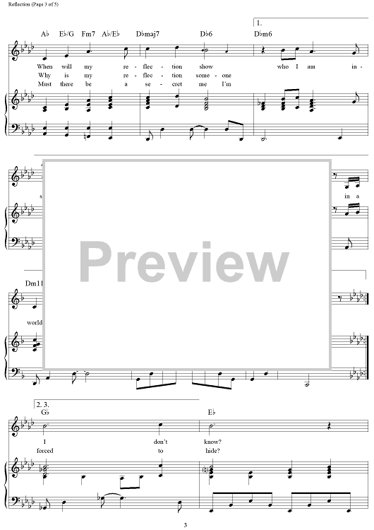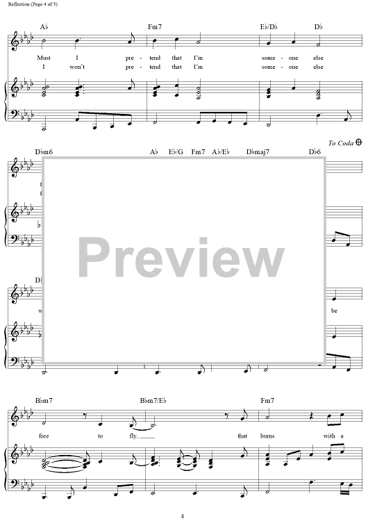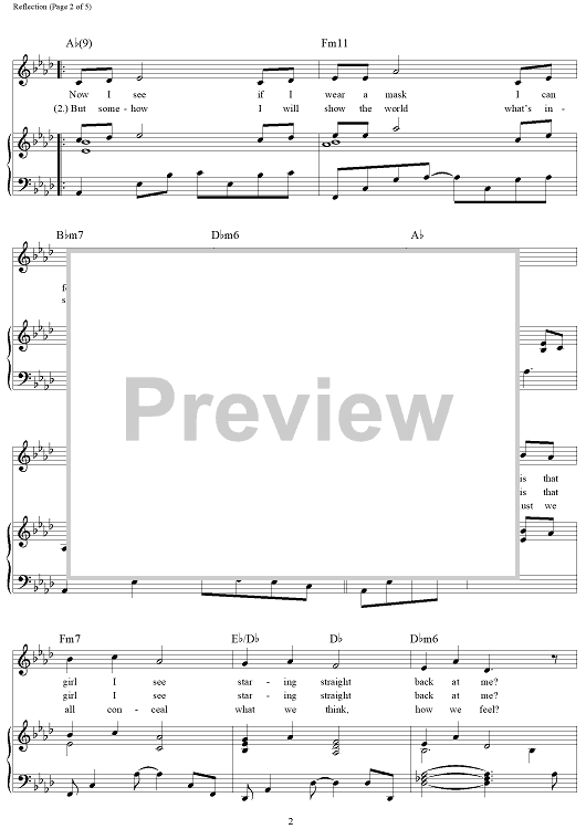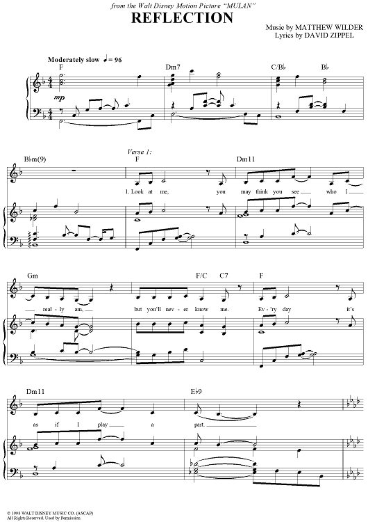 Digital Sheet Music for Reflection by David Zippel, Matthew Wilder, Christina Aguilera scored for Piano/Vocal/Chords; id:263368
