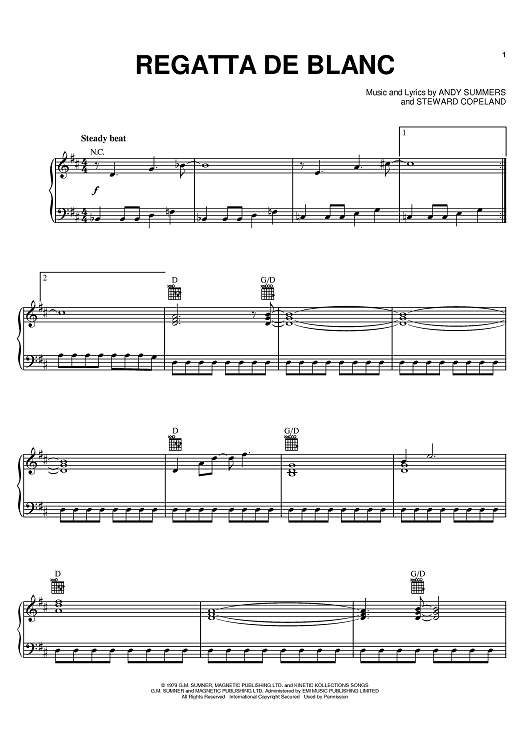 Digital Sheet Music for Regatta De Blanc by Sting, The Police, Stewart Copeland, Andy Summers scored for Piano/Vocal/Chords; id:398614
