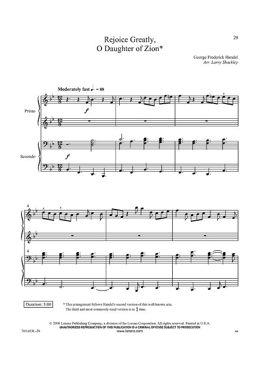 Digital Sheet Music for Rejoice Greatly, O Daughter of Zion - Bonus Material by George Frideric Handel, Larry Shackley scored for Piano Duet; id:433859