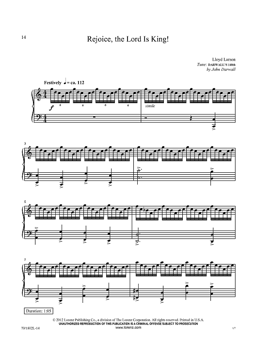 Digital Sheet Music for Rejoice, the Lord Is King! by John Darwall, Lloyd Larson scored for Piano Solo; id:434926