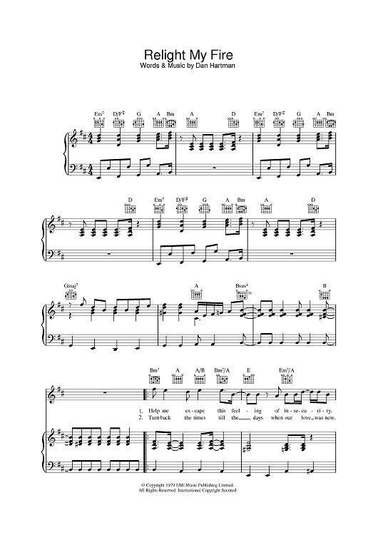 Digital Sheet Music for Relight My Fire by Dan Hartman, Take That scored for Piano/Vocal/Chords; id:387485