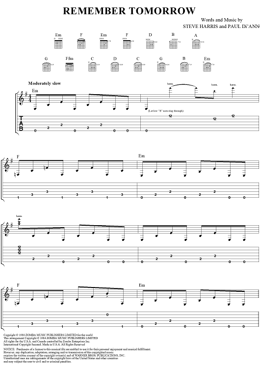 Digital Sheet Music for Remember Tomorrow by Steve Harris, Paul Di'anno, Iron Maiden scored for Guitar Tab/Vocal; id:119675