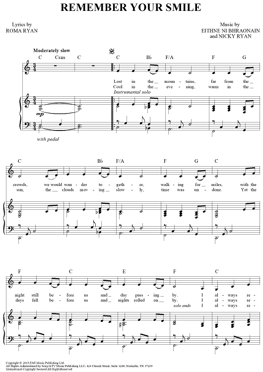 Digital Sheet Music for Remember Your Smile by Enya, Nicky Ryan, Roma Ryan scored for Piano/Vocal/Chords; id:464362