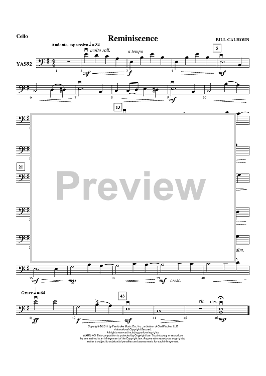 "Reminiscence - Cello" Sheet Music by Bill Calhoun