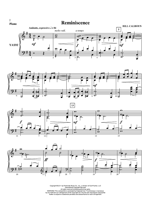 "Reminiscence - Piano" Sheet Music by Bill Calhoun