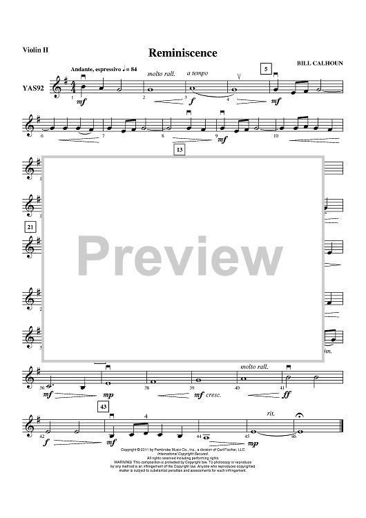 "Reminiscence - Violin 2" Sheet Music by Bill Calhoun