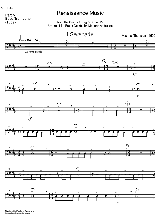 Digital Sheet Music for Renaissance Music - Bass Trombone by , Mogens Andresen, Magnus Thomsen scored for Brass Quintet; id:326860