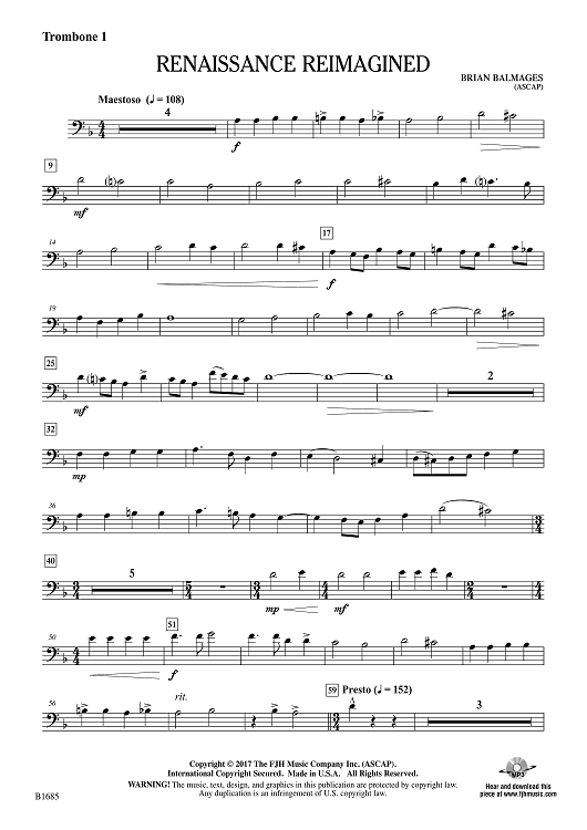 Digital Sheet Music for Renaissance Reimagined - Trombone 1 by Brian Balmages scored for Concert Band; id:510247