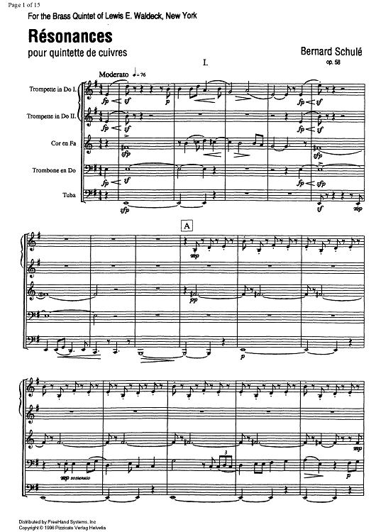 Digital Sheet Music for Résonances Op.58 - Score by , Bernard Schulé scored for Brass Quintet; id:330740