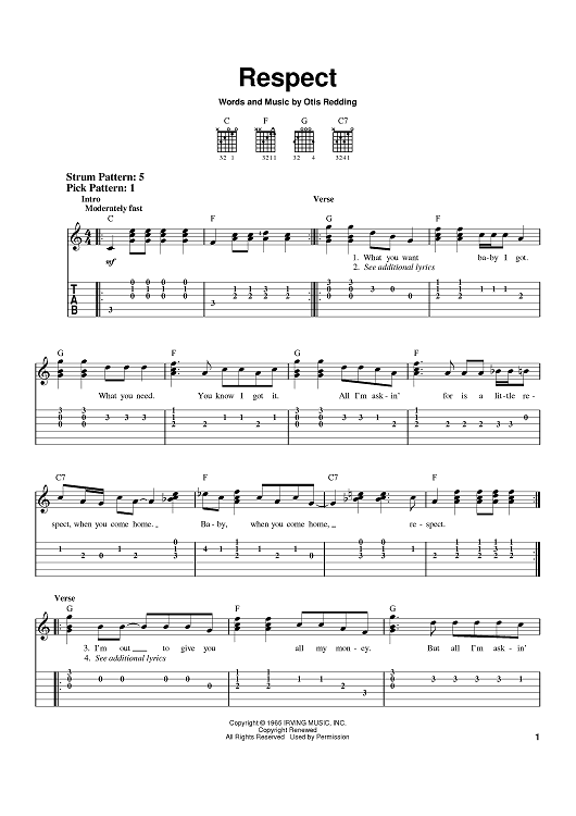 Digital Sheet Music for Respect by Otis Redding, Aretha Franklin scored for Easy Guitar Tab; id:370212