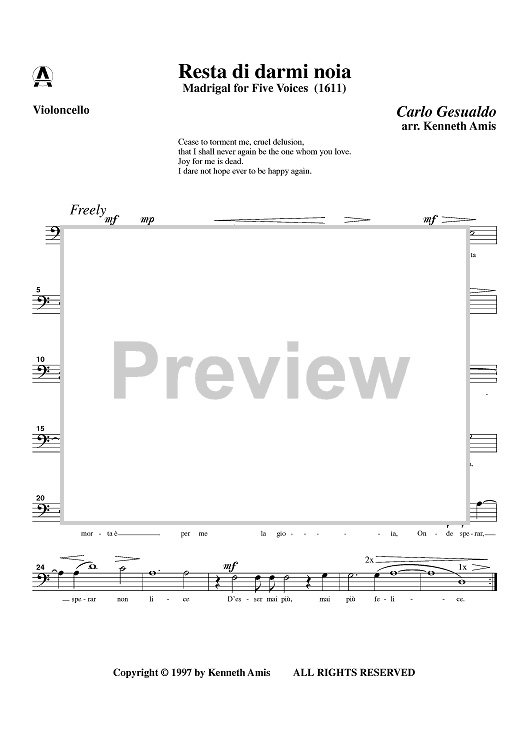 Digital Sheet Music for Resta di darmi noia - Cello by , Carlo Gesualdo, Kenneth Amis scored for String Quintet; id:365483