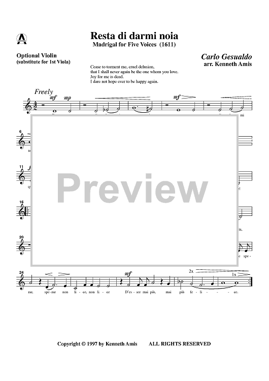 Digital Sheet Music for Resta di darmi noia - Optional Violin (for Viola 1) by , Carlo Gesualdo, Kenneth Amis scored for String Quintet; id:365484
