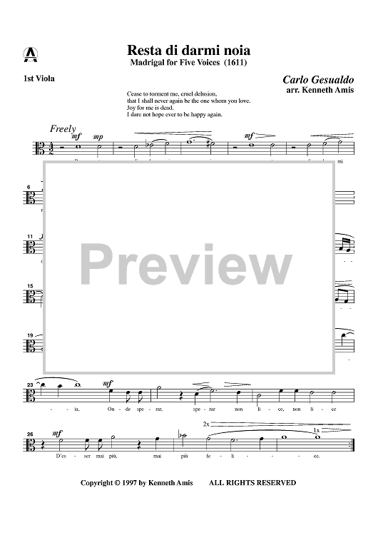 Digital Sheet Music for Resta di darmi noia - Viola 1 by , Carlo Gesualdo, Kenneth Amis scored for String Quintet; id:365481