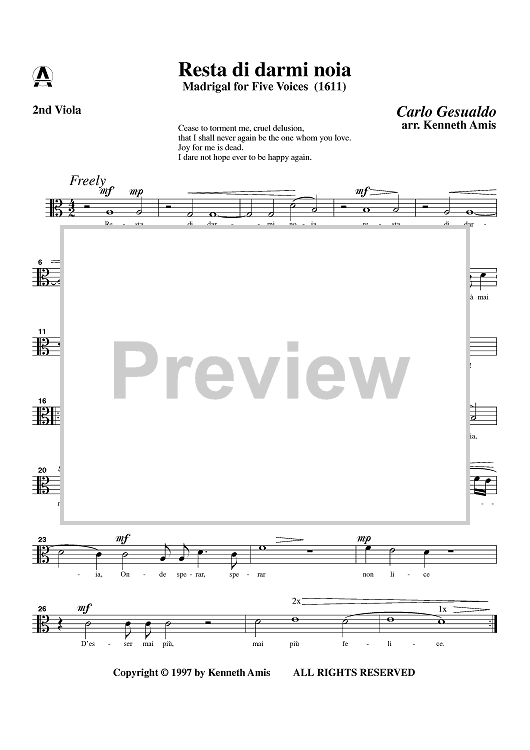 Digital Sheet Music for Resta di darmi noia - Viola 2 by , Carlo Gesualdo, Kenneth Amis scored for String Quintet; id:365482