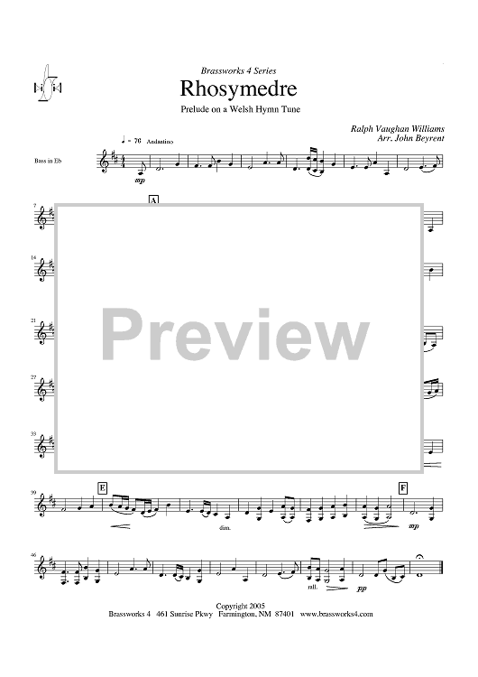 Digital Sheet Music for Rhosymedre - Prelude on a Welsh Hymn Tune - Bass in Eb by Ralph Vaughan Williams, John Beyrent scored for Brass Ensemble; id:428346