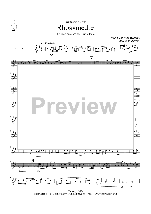 "Rhosymedre - Prelude on a Welsh Hymn Tune - Cornet 1 in Bb" Sheet Music by Ralph Vaughan Williams