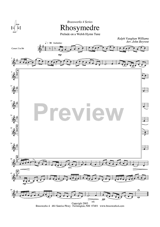 "Rhosymedre - Prelude on a Welsh Hymn Tune - Cornet 2 in Bb" Sheet Music by Ralph Vaughan Williams