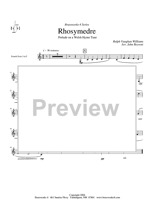 Digital Sheet Music for Rhosymedre - Prelude on a Welsh Hymn Tune - Horn 3 in F by Ralph Vaughan Williams, John Beyrent scored for Brass Ensemble; id:428226