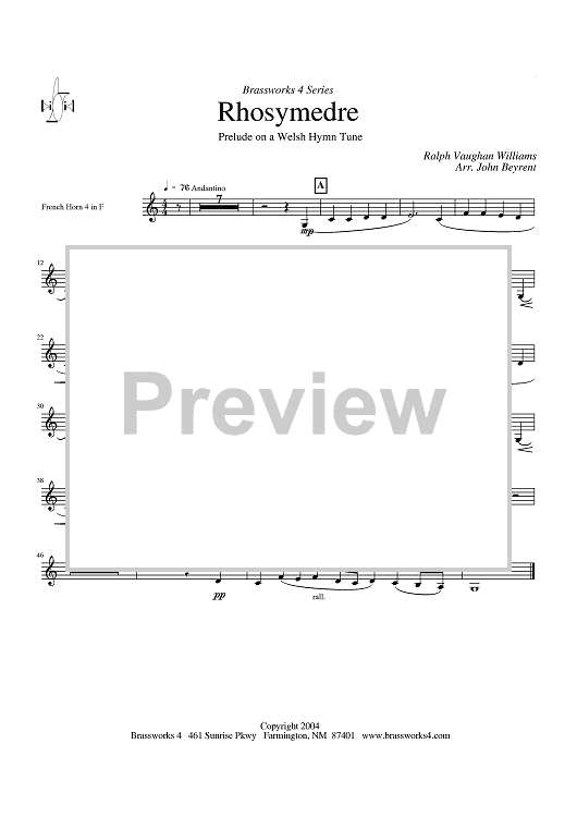 Digital Sheet Music for Rhosymedre - Prelude on a Welsh Hymn Tune - Horn 4 in F by Ralph Vaughan Williams, John Beyrent scored for Brass Ensemble; id:428227