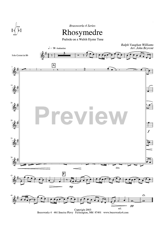 Digital Sheet Music for Rhosymedre - Prelude on a Welsh Hymn Tune - Solo Cornet in Bb by Ralph Vaughan Williams, John Beyrent scored for Brass Ensemble; id:428332