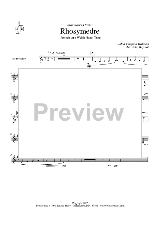 Digital Sheet Music for Rhosymedre - Prelude on a Welsh Hymn Tune - Solo Horn in Eb by Ralph Vaughan Williams, John Beyrent scored for Brass Ensemble; id:428337