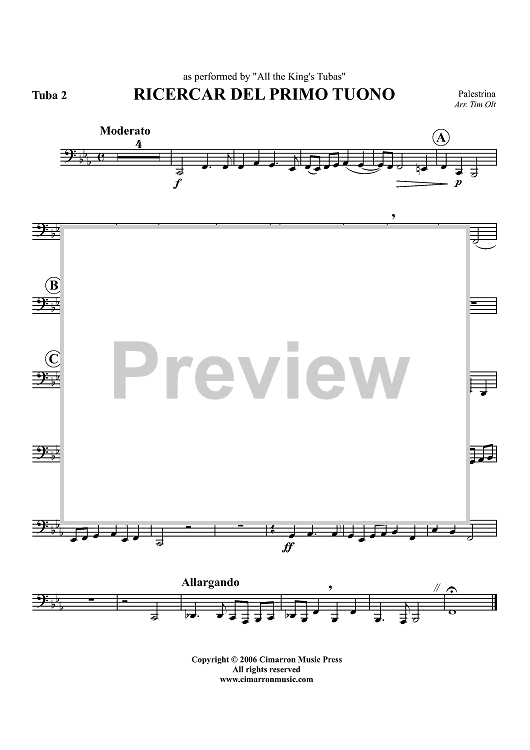 Digital Sheet Music for Ricercar del Primo Tuono - Tuba 2 by Giovanni Pierluigi da Palestrina, Tim Olt, All the King's Tubas scored for Tuba Quartet; id:319978