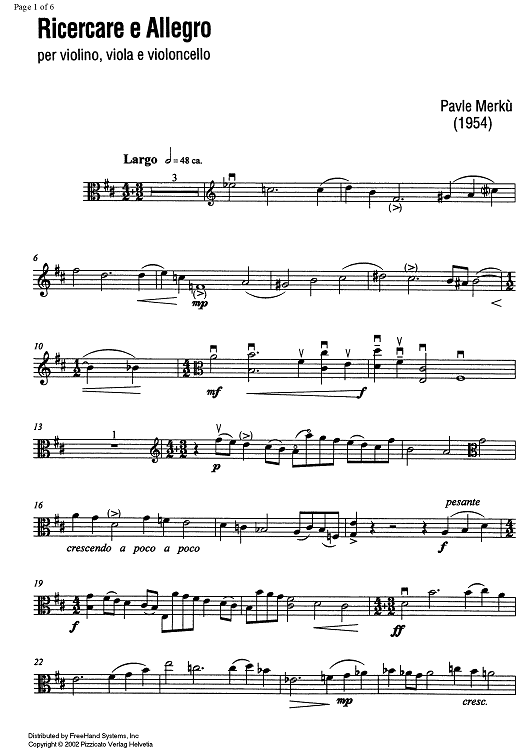"Ricercare e Allegro - Viola" Sheet Music by Pavle Merkù