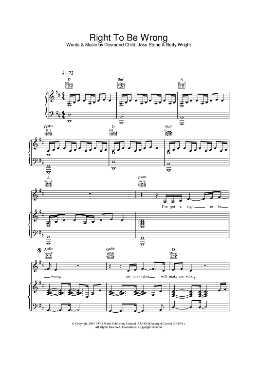 Digital Sheet Music for Right To Be Wrong by Desmond Child, Joss Stone, Betty Wright scored for Piano/Vocal/Chords; id:381282