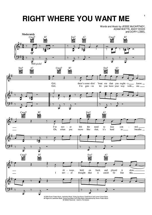 Digital Sheet Music for Right Where You Want Me by Jesse McCartney, Adam Watts, Andy Dodd, Dory Lobel scored for Piano/Vocal/Chords; id:393551