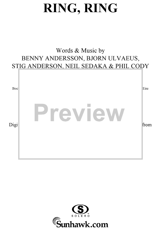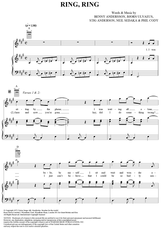 Digital Sheet Music for Ring, Ring by ABBA, Neil Sedaka, Phil Cody, Benny Andersson, Bjorn Ulvaeus, Stig Anderson scored for Piano/Vocal/Chords; id:292357