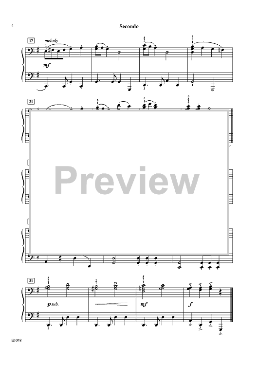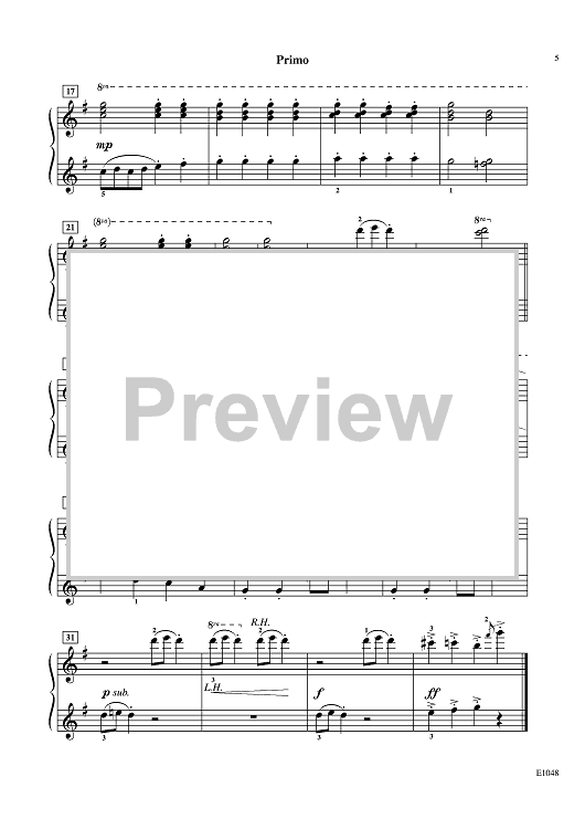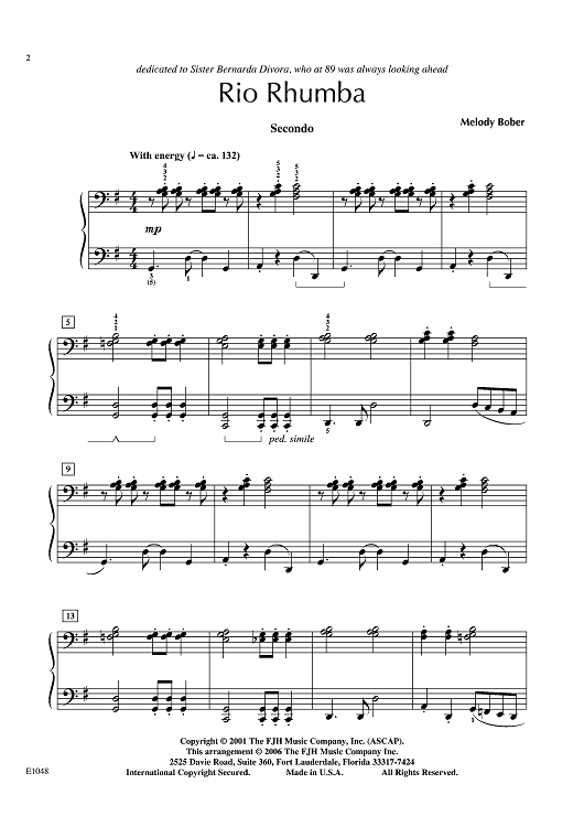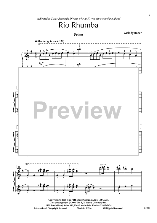 Written for one piano and four hands, this Intermediate level piece captures the excitement and energy from the streets of Rio. Staccato articulations, syncopated rhythms, Rhumba beats, and a unique melodic structure capture the essence and festive moods from this sultry city in Brazil. Sure to be a favorite!
