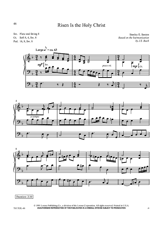Digital Sheet Music for Risen Is the Holy Christ by Johann Sebastian Bach, Stanley E. Saxton scored for Organ Solo; id:433967