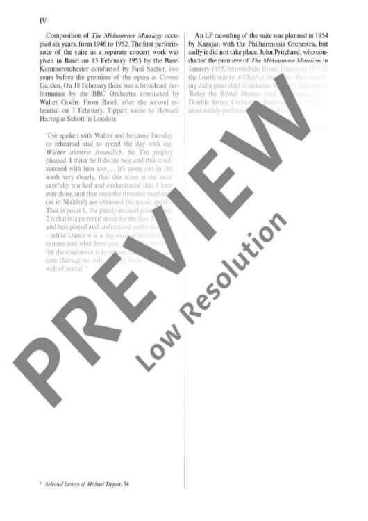 Tippett’s decision to extract the four Ritual Dances from his opera 'The Midsummer Marriage' as a self-contained concert suite reflects the fact that the medium of dance was always present in his conception of the opera. From the start, there was to be an interaction within the opera between the real world and the world of mythology, partly Greek, partly Celtic. This mythological element culminates, in the finished opera, in the 'Ritual Dances' of Acts 2 and 3. Tippett himself described his opera as ‘a kind of elaborate 'L’après midi d’un faune’, in which the 'Ritual Dances' display a powerful sexual energy, though of a very different kind from Debussy’s voluptuous langour. Composition of The Midsummer Marriage occupied Tippett for six years from 1946 to 1952. The first performance of the Ritual Dances as a concert suite was given in Basel on 13 February 1953 by the Basel Kammerorchester conducted by Paul Sacher, and preceded the premiere of the complete opera by two years. Today the Ritual Dances rival the Concerto for Double String Orchestra (ETP 1331) as Tippett’s most widely-performed orchestral work.