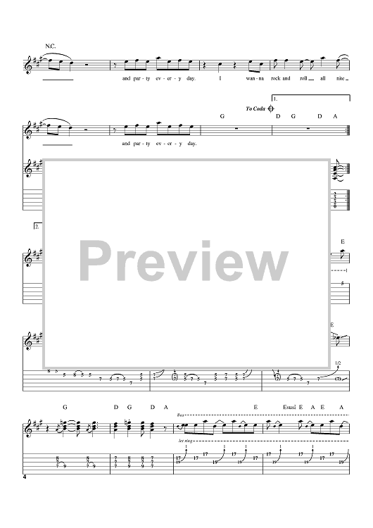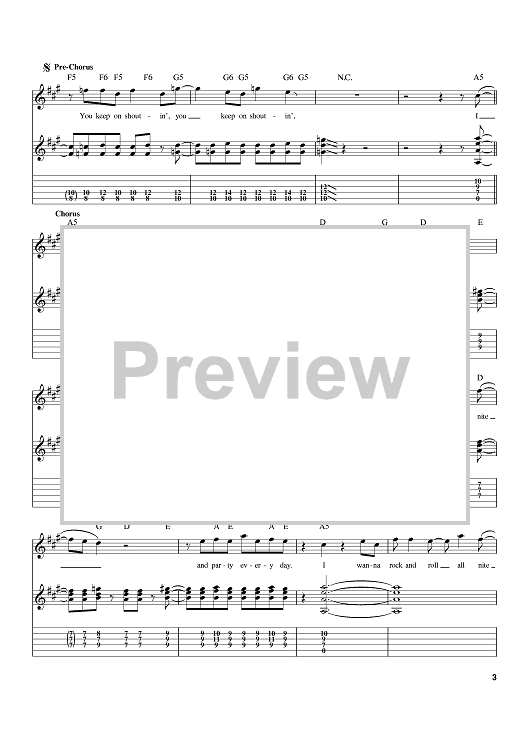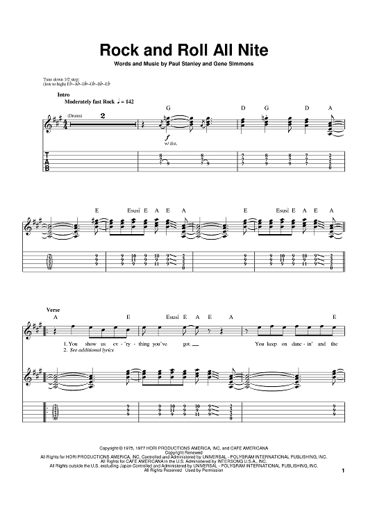 Digital Sheet Music for Rock And Roll All Nite by Paul Stanley, Gene Simmons, KISS scored for Guitar Tab; id:384722
