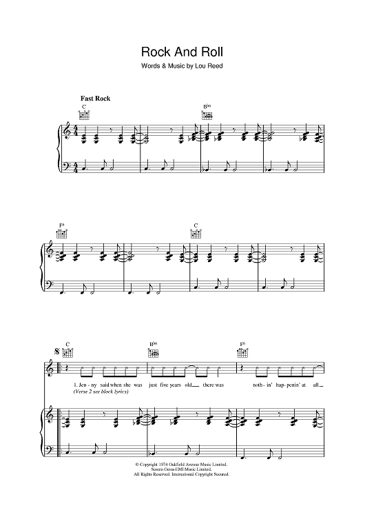 Digital Sheet Music for Rock And Roll by Lou Reed scored for Piano/Vocal/Chords; id:401916
