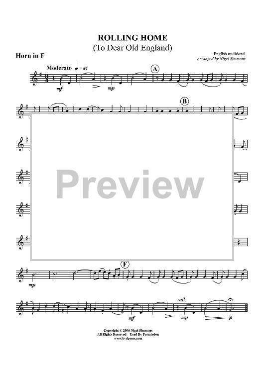 Digital Sheet Music for Rolling Home (To Dear Old England) - Horn in F by Nigel Simmons, English Traditional scored for Brass Quintet; id:428084