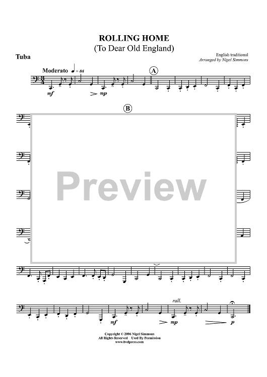 Digital Sheet Music for Rolling Home (To Dear Old England) - Tuba by Nigel Simmons, English Traditional scored for Brass Quintet; id:428086
