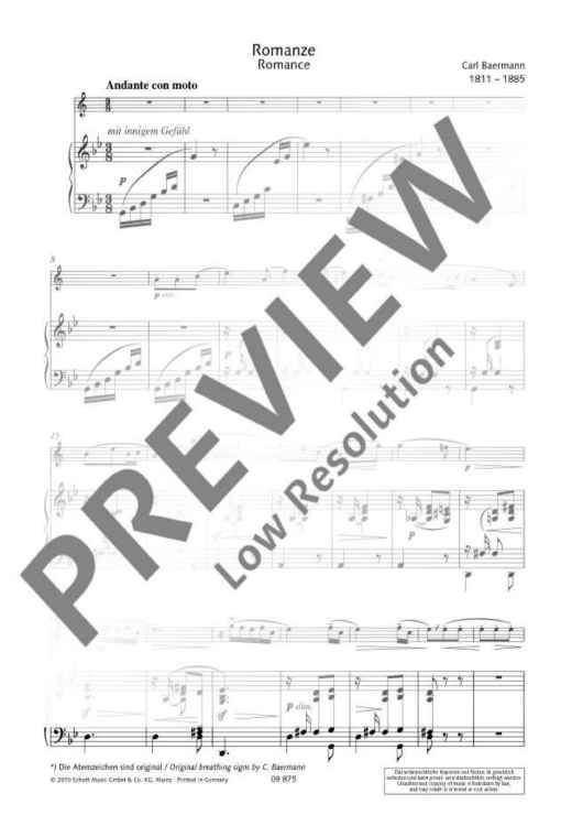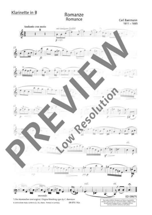 The clarinet virtuoso and educationalist Carl Baermann from Munich was one of the most important musical figures of the 19th century. His teaching literature strongly influenced clarinet education and the further technical development of the clarinet. His Romantic compositions form an integral part of the clarinet repertoire. Romanze for clarinet and piano, a sentimental work of great emotional substance, has proved a popular concert and encore piece. Baermann's Romanze is also suitable as a performance piece for competitions - a valuable addition to the repertoire of every clarinettist.