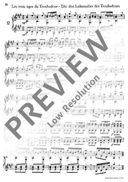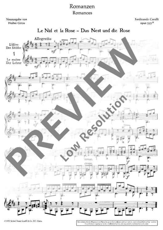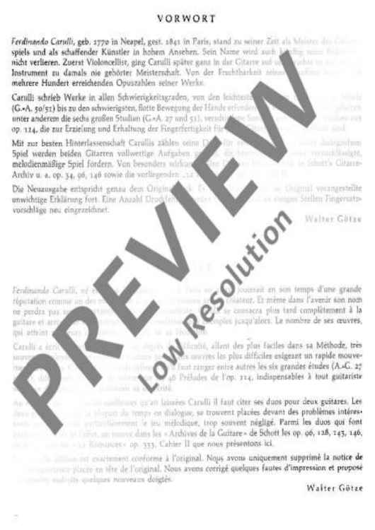Ferdinando Carulli, geb. 1770 in Neapel, gest. 1841 in Paris, stand zu seiner Zeit als Meister des Gitarrenspiels und als schaffender Künstler in hohem Ansehen. Sein Name wird auch künftig seine Bedeutung nicht verlieren. Zuerst Violoncellist, ging Carulli später ganz in der Gitarre auf und brachte es auf seinem Instrument zu damals nie gehörter Meisterschaft. Von der Fruchtbarkeit seines Schaffens zeugen die mehrere Hundert erreichenden Opuszahlen seiner Werke. Carulli schrieb Werke in allen Schwierigkeitsgraden, von den leichtesten in seiner vielbenutzten Schule (GA 50/51) bis zu den schwierigsten, flotte Bewegung der Hände erfordernden Werken. Zu diesen gehören unter anderem die sechs großen Studien (GA 27 und 51), verschiedene Sonaten sowie die 48 Präludien aus op. 114, die zur Erzielung und Erhaltung der Fingerfertigkeit für jeden Gitarristen unentbehrlich sind. Mit zur besten Hinterlassenschaft Carullis zählen seine Duos für zwei Gitarren. In meist dialogischem Spiel werden beiden Gitarren vollwerite Aufgaben gestellt, die besonders das meist vernachlässigte, melodienmäßige Spiel fördern.