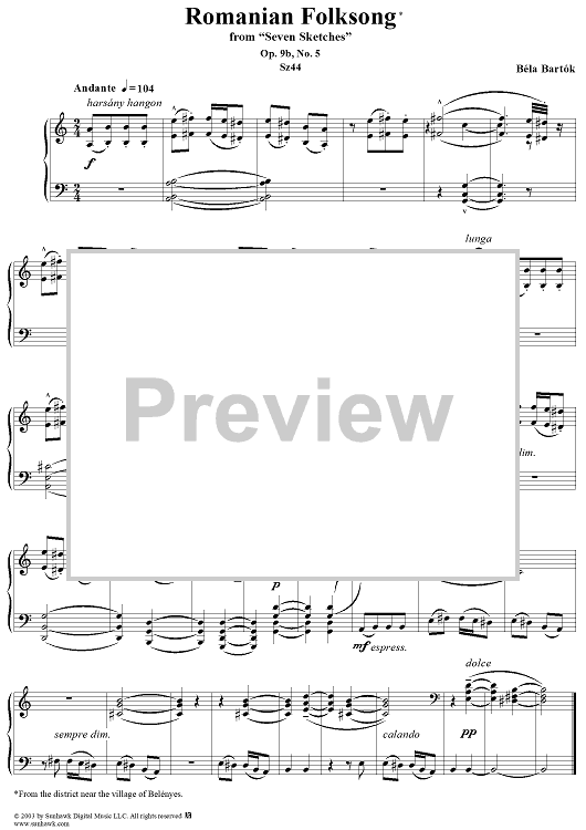 Digital Sheet Music for Romanian Folksong by Bela Bartok scored for Piano Solo; id:294166