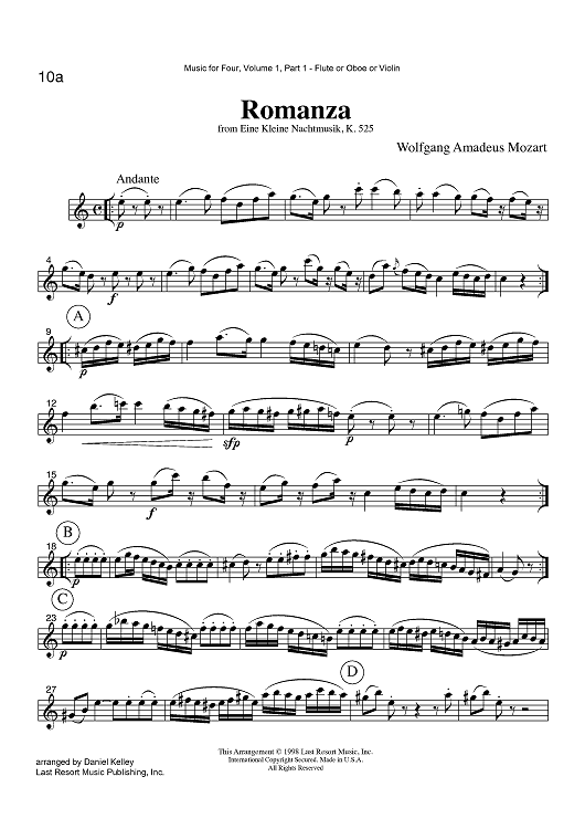 Digital Sheet Music for Romanza - from Eine Kleine Nachtmusik, K. 525 - Part 1 Flute, Oboe or Violin by , Wolfgang Amadeus Mozart, Daniel Kelley scored for Instrumental Quartet; id:423542