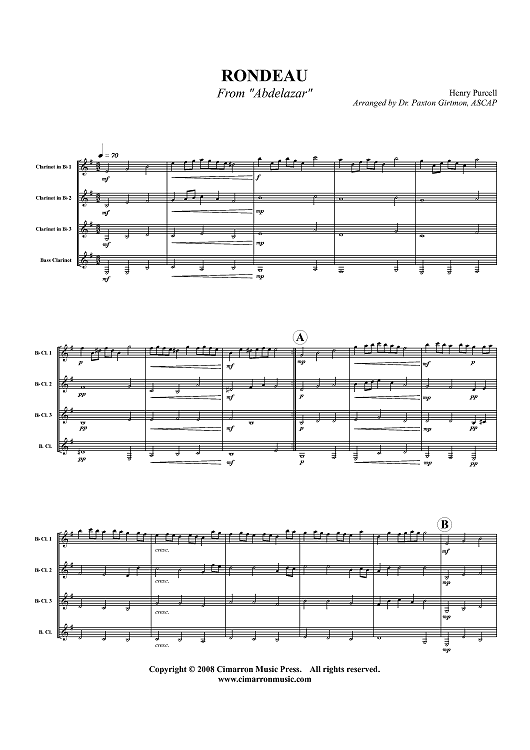 Digital Sheet Music for Rondeau from "Adbelazar" - Score by Henry Purcell, Paxton Girtmon scored for Clarinet Quartet; id:413987