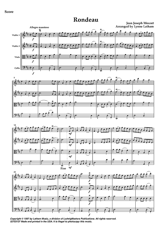 Digital Sheet Music for Rondeau - Score by Jean-Joseph Mouret, Lynne Latham scored for String Quartet; id:449719