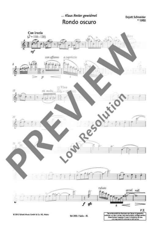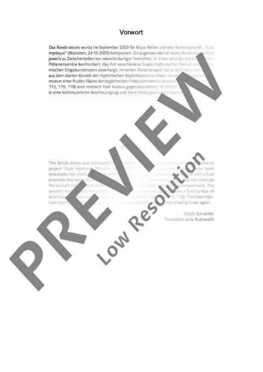 In Enjott Schneider's 'Rondo oscuro', an eye-twinkling naive rondo theme leads to more complex intermediate parts in which the soloist is faced with a flute ensemble demanding various degrees of rhythmic freedom or rhythmic involvement of him: In the first interlude, he has to break free from the straitjacket of the rhythmic accompanying canon with a rubato; in the second interlude, he has to juxtapose the fluid surface of the accompanying flute parts with a metrically free cadence; in the third interlude, he is involved in continuous acceleration and then deceleration. A really extraordinary and entertaining composition!
