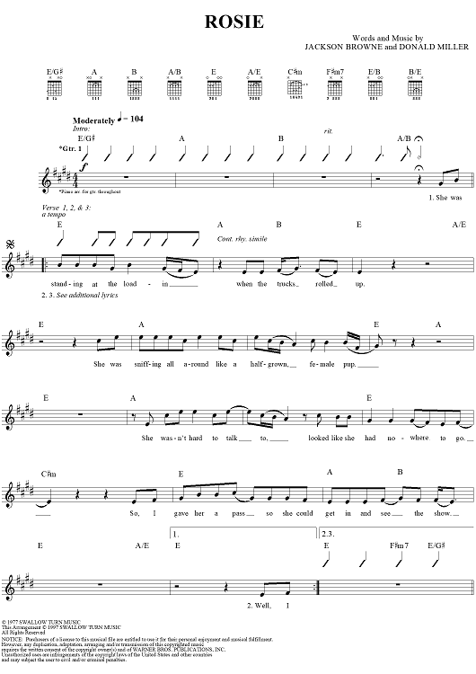 Digital Sheet Music for Rosie by Jackson Browne, Donald Miller scored for Guitar Tab/Vocal; id:116452