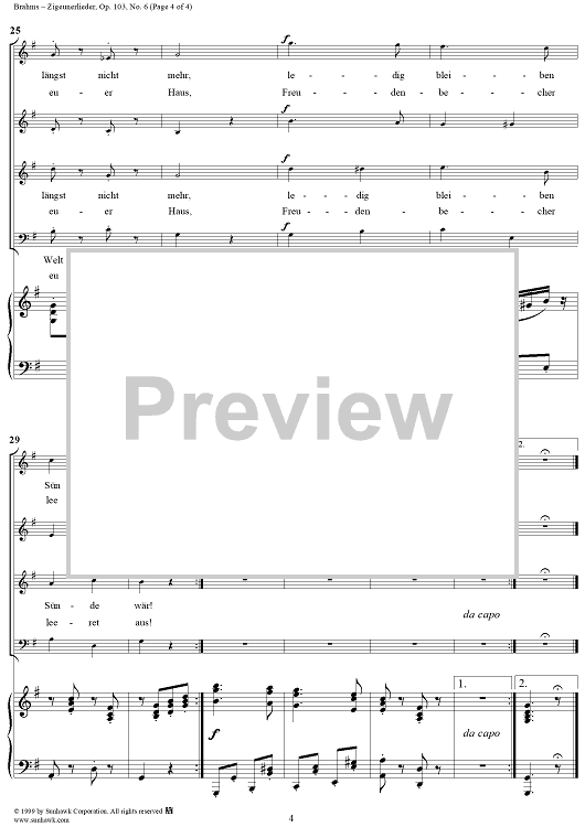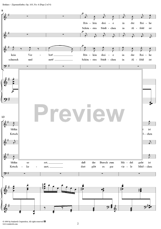 Digital Sheet Music for Röslein dreie in der Reihe blühn so rot - From "Zigeunerlieder" Op. 103, No. 6 by Johannes Brahms scored for Voice/Piano; id:274769