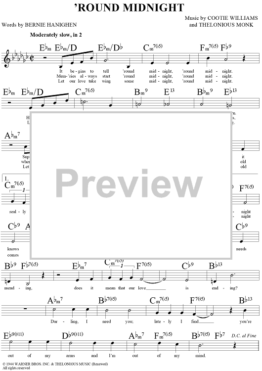 Digital Sheet Music for 'Round Midnight by Charlie Parker, Cootie Williams, Bernie Hanighen, Thelonious Monk scored for Lead Sheet; id:109245
