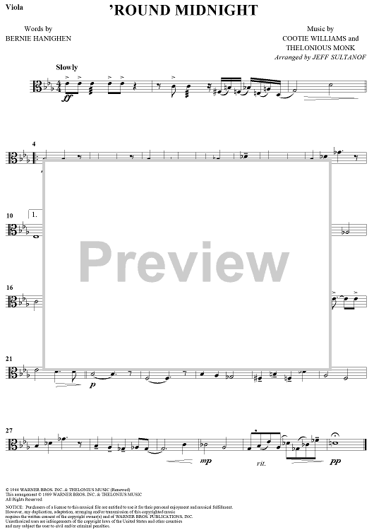"'Round Midnight - Viola" Sheet Music by Cootie Williams